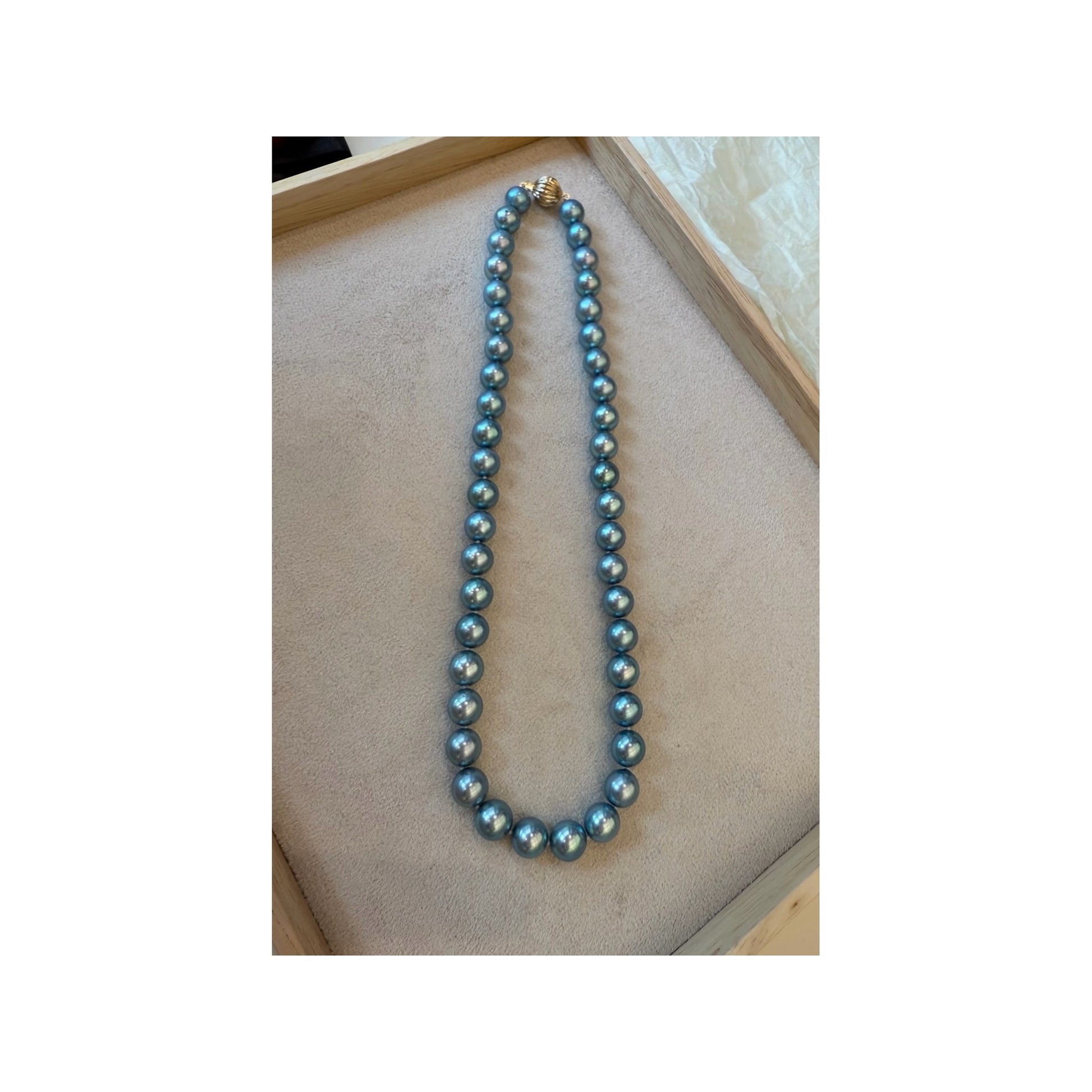 This fine strand features Ocean Blue Akoya pearls (approx. 9 mm) — celebrated for their luminous glow and refined hue.